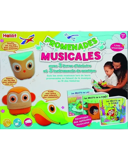 3 livres d'histoires avec 3 instruments de musique. Suis tes amis lors de leur promenade en faisant de la musique au fil des histoires.