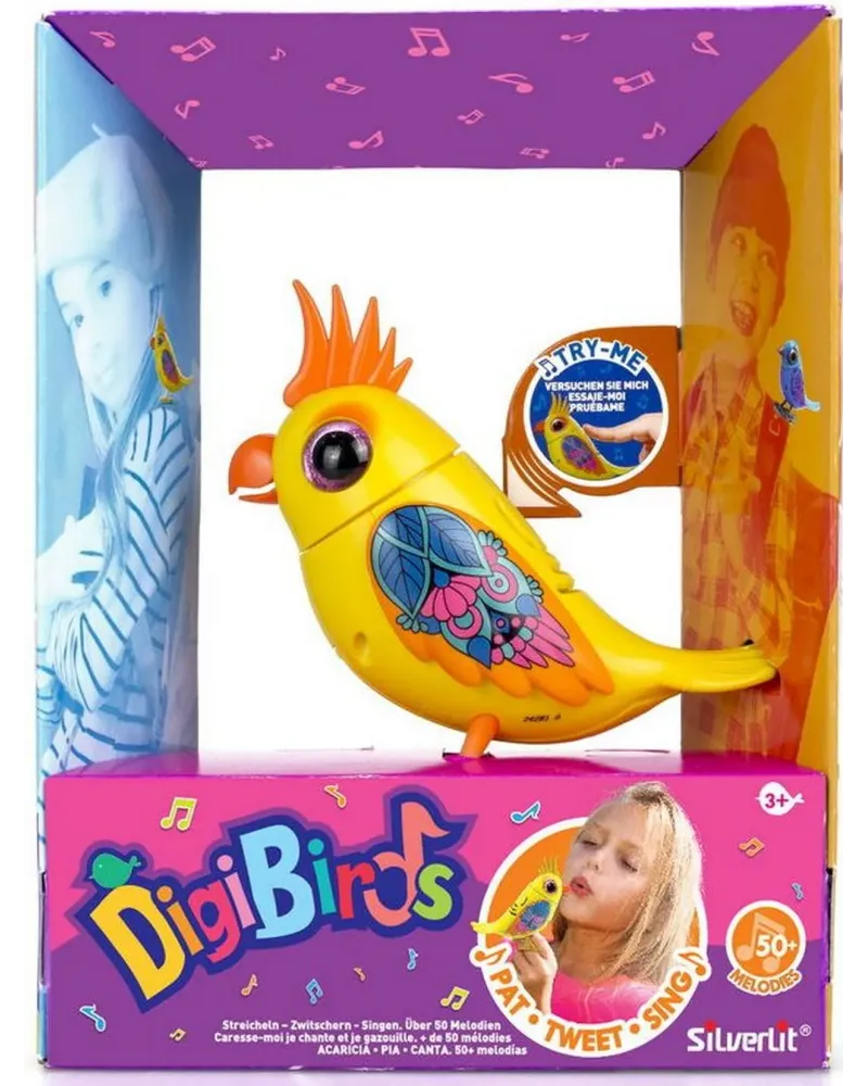 Siffle comme un vrai oiseau. Compagnon intéractif qui réagit aux caresses et à la voix, bouge la tête et le bec. Il réagit également en présence d'autres oiseaux Digibirds. 4 modèles à collectionner.