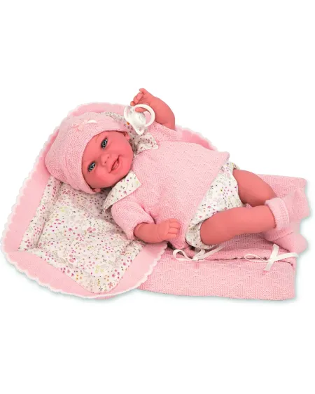 35 cm. Traits réalistes. Corps souple, jambes et bras en vinyle. Tétine et couverture incluses.