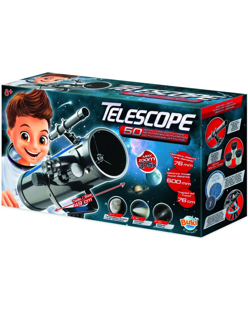 50 activités. Lentille de 76 mm, zoom X 375. Tubes et trépied en métal. Nombreux accessoires : objectif chercheur de 6 x 25 mm, 1 lentille de Barlow 3 x et une carte du ciel.