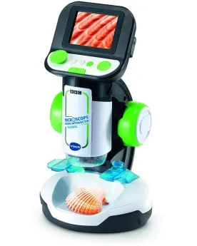 Ecran LCD couleur de 2,4’’, joystick directionnel, zoom x 200, zone d'observation pour objets 3D, lames illustrées et lames à personnaliser incluses.